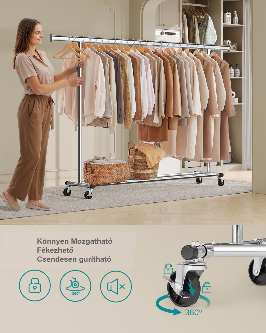 160cm Kihúzható Ruhatartó Sztender Fékezhető Kerekekkel