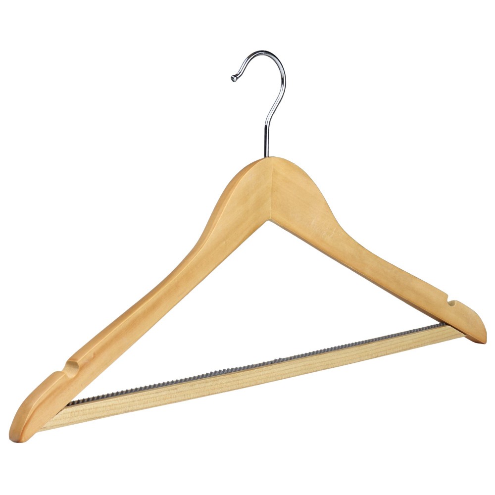 44cm (szélesség) x 1,5cm (vastagság) ing/öltöny fa vállfa kis bevágással a vállon, gumis csúszásgátlós nadrágtartóval.